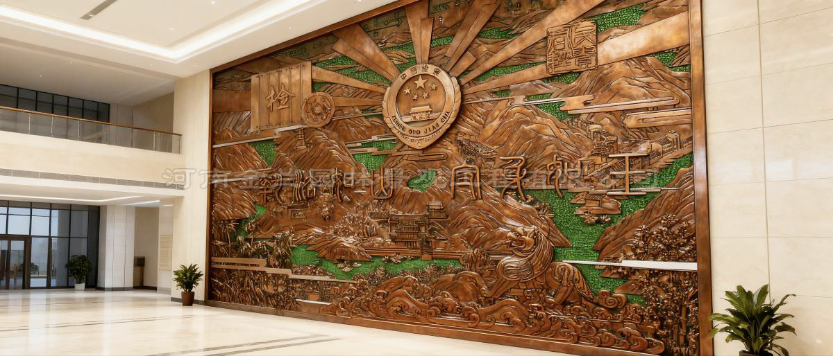 室外文化墻 鑄銅防腐+琺瑯彩 地域檢察成就展示+法治標語 邊疆某檢察院外墻浮雕,采用耐候鋼材質(zhì),歷經(jīng)10年風沙仍保持清晰敘事紋路