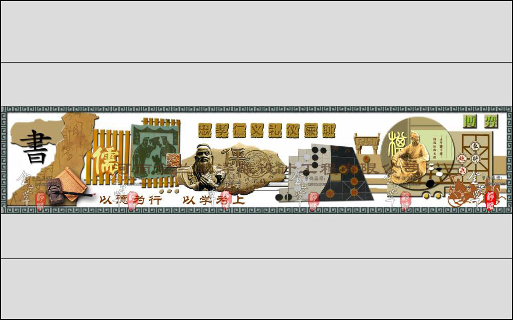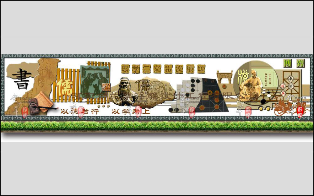 “儒”學文化是中國的國學文化,影響中國幾千年,畫面中的“儒”字寫在竹簡上,更有文化韻味,竹簡上還雕刻著周禮圖及馬車圖,是對中國遠古文化元素的表現,畫面中心的孔子施禮頭像及其他的著作《論語》,加上中國的傳統紋飾,讓畫面傳統文化裝飾氣息更濃。“以德為行,以學為上”是儒學文化所追求的。