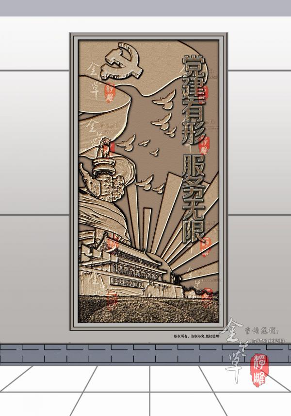 浮雕在設(shè)計(jì)思路上:浮雕下面部分是天安門廣場(chǎng),天安門廣場(chǎng)是中國的象征,也黨和國家最高權(quán)力的象征,也象征著祖國的繁榮和富強(qiáng);天安門廣場(chǎng)后面的太陽代表著我們的黨,光芒四射,為人民帶來溫暖和光明;中華柱和飄揚(yáng)的絲帶代表著中華民族的富強(qiáng)、文明、和諧,如同絲帶般會(huì)迎著清風(fēng)朝著希望走下去;浮雕上面部分飄揚(yáng)的黨旗代表著在黨的關(guān)懷和領(lǐng)導(dǎo)下,中國才能擁有如此這樣,沒有共產(chǎn)黨就沒有新中國;飛翔的和平鴿寓意著安康、和諧、和平、美好、希望;“外墻有型,服務(wù)無限”道出了我們黨全心全意服務(wù)為民,也是黨員建設(shè)的口號(hào)。