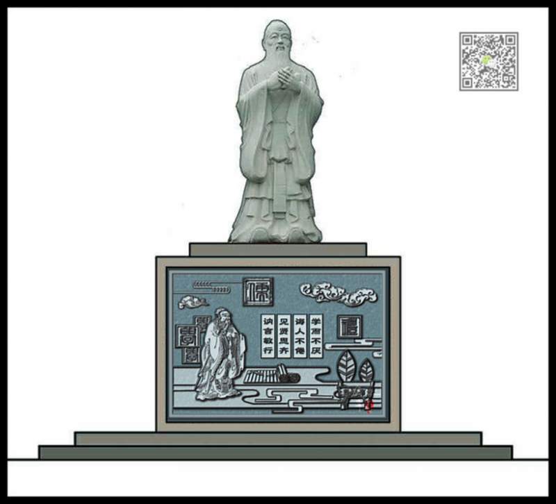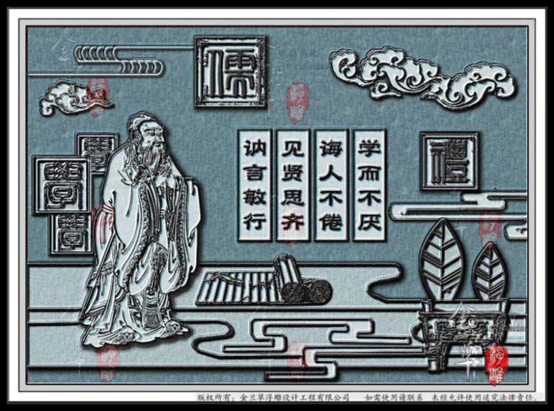 本浮雕主題以孔子為主,孔子是我國偉著名的大思想家、大教育家,他開創了私人講學的風氣,是儒家學派的創始人,浮雕設計中的“儒”字正是對孔子開創儒學的表達;孔子建構了完整的“德道”思想體系:主張以“禮”之德行。孔子的禮說,體現了禮制精神,即現代意義上的秩序和制度,浮雕設計中的“禮”字,也是對孔子主張以禮的闡述。