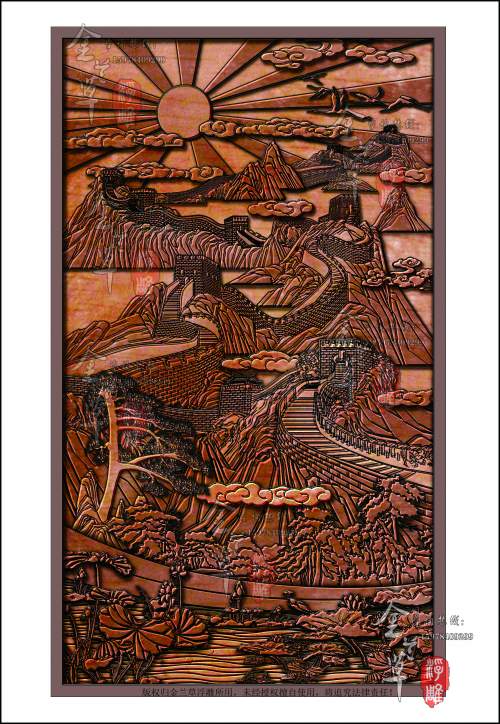 在裝飾性浮雕題材的選擇上,萬里長城永遠是眾多單位或企業(yè)最鐘愛的題材,它即大氣磅礴,又不失美好意義,更與我們偉大的祖國相聯(lián)系,是偉大中華名族的象征,更是一種精神文化的描述。這也難怪,歷朝歷代長城都是歌頌的對象,更是名人大家書畫作品中的主角。