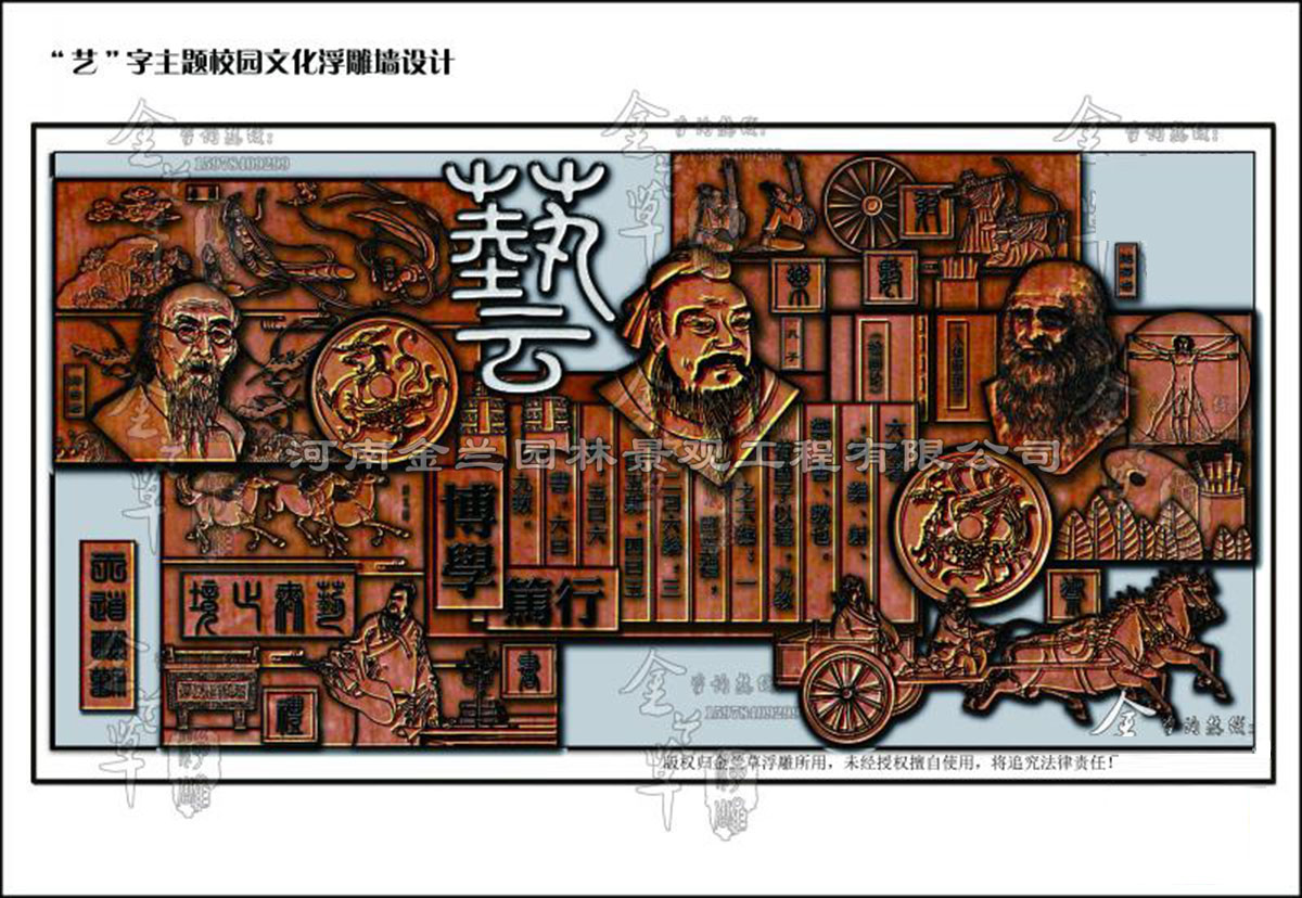 浮雕設計圖左上側黃金分割點上為一個篆體的“藝”字,醒目突出,為古代篆體,即體現了古樸的文化深度,又直觀的表現了整幅浮雕設計的主題:“藝”,醒目顯眼,大方自然。
