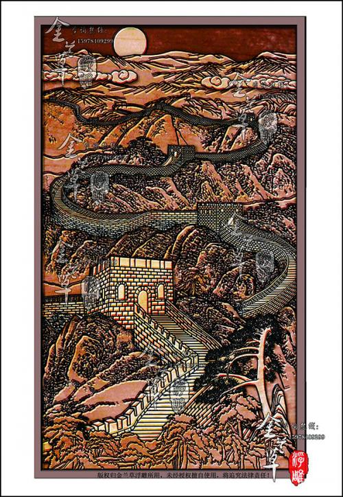 大堂做背景墻,如一些壁畫、浮雕裝飾,任何時候都是很流行的,酒店、會所、行政單位居多,在做大廳浮雕或者壁畫的時候,長城浮雕背景墻往往是最受歡迎,長城群山峻嶺,代表祖國形象,也有靠山之意,以下是金蘭草浮雕所做的長城題材大堂浮雕背景墻設計,希望對你有所幫助: