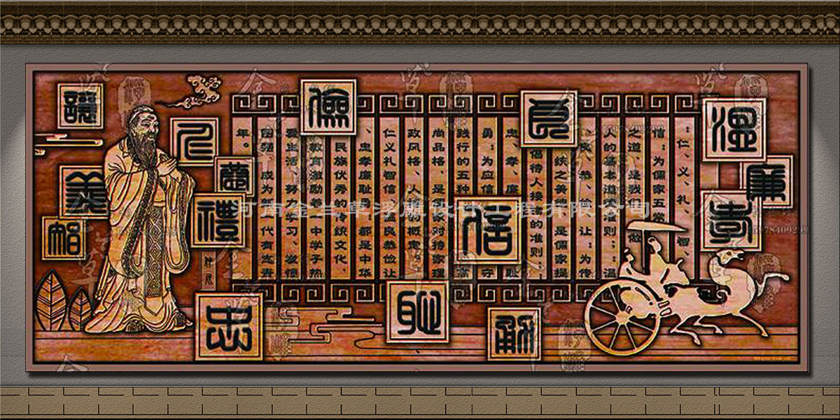 在儒家文化中“仁、義、禮、智、信”為儒家五常之道,這大概很多人都熟知,也被眾文人銘記于心,儒家“五常”是我們做人的基本的道德準(zhǔn)則。儒家文化浮雕設(shè)計以直白的文字表現(xiàn),將其置于孔子周圍,更為顯眼醒目。