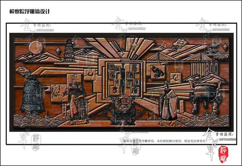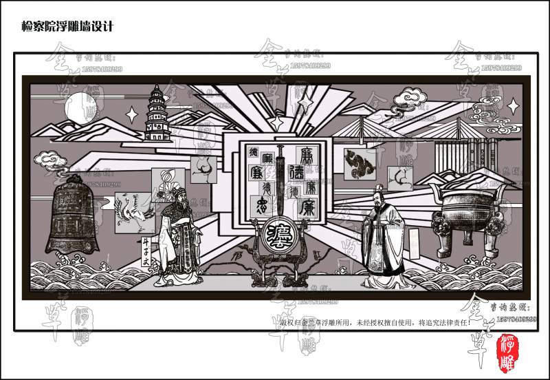 本浮雕設(shè)計(jì)以“廉政為民,厚德載法”為主題,整幅浮雕設(shè)計(jì)中,在充分表達(dá)檢察院文化元素外,更多的運(yùn)用了荊楚文化元素,將兩種元素的完美結(jié)合。浮雕設(shè)計(jì)的中心部分以“劍”為浮雕的中心,“劍”在浮雕中的寓意為“法律之劍”“廉政之劍”“監(jiān)督之劍”,與“廉”“徳”并行,將“腐”擊碎,“廉”“徳”篆刻在荊州古城墻上,象征著荊州的“廉政為民,厚德載法”的精神源遠(yuǎn)流長(zhǎng),古城左右各站立楚國(guó)著名歷史人物斗子文和孫叔敖,他們都是荊楚文化中廉政文化及法制文化建設(shè)的著名歷史人物,是對(duì)“廉政為民,厚德載法”的更進(jìn)一步補(bǔ)充。