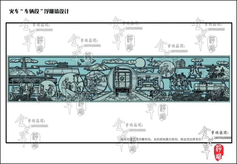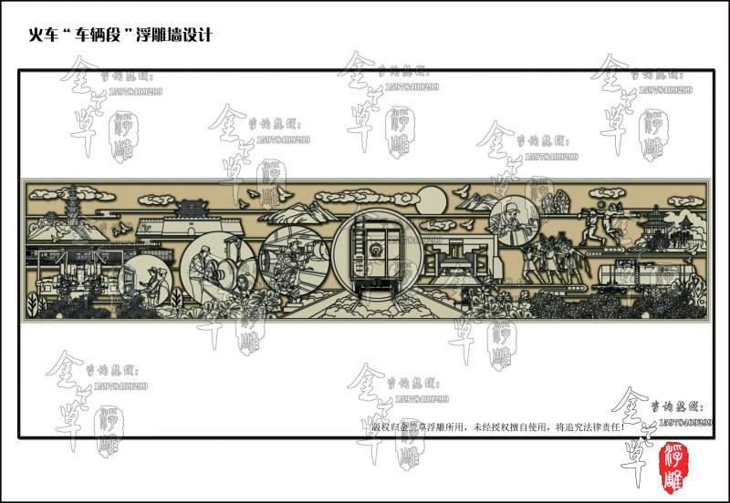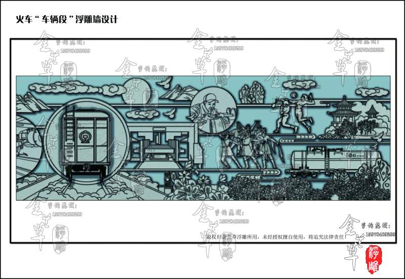 整幅浮雕因?yàn)槊娣e大,所以在設(shè)計(jì)中注重對(duì)細(xì)節(jié)的描繪,整體和諧統(tǒng)一,畫面敘事清晰,在火車單位得到很多客戶的認(rèn)可,為金蘭草浮雕的專業(yè)性加分。金蘭草浮雕不僅懂得設(shè)計(jì),更注重浮雕施工的藝術(shù)要求,一千余平米浮雕制作工作間,保證作品即設(shè)計(jì)的有藝術(shù),做出來(lái)更精致。