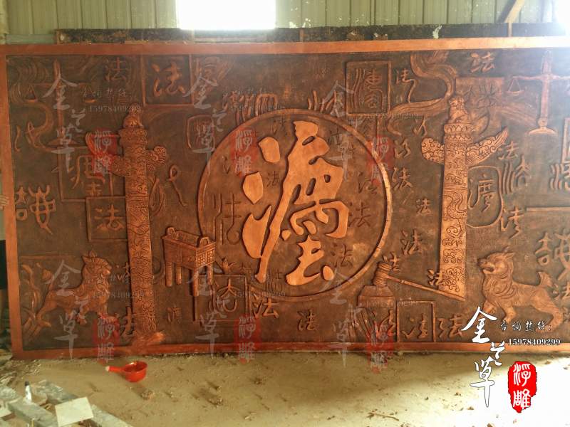 浮雕在做效果前先征詢客戶意見,了解客戶需要的效果,仿銅浮雕在做重色底色時避免太暗、太臟,可適當做些銅綠色,增加浮雕畫面的美感,仿銅浮雕分為仿青銅、仿黃銅和仿紫銅。