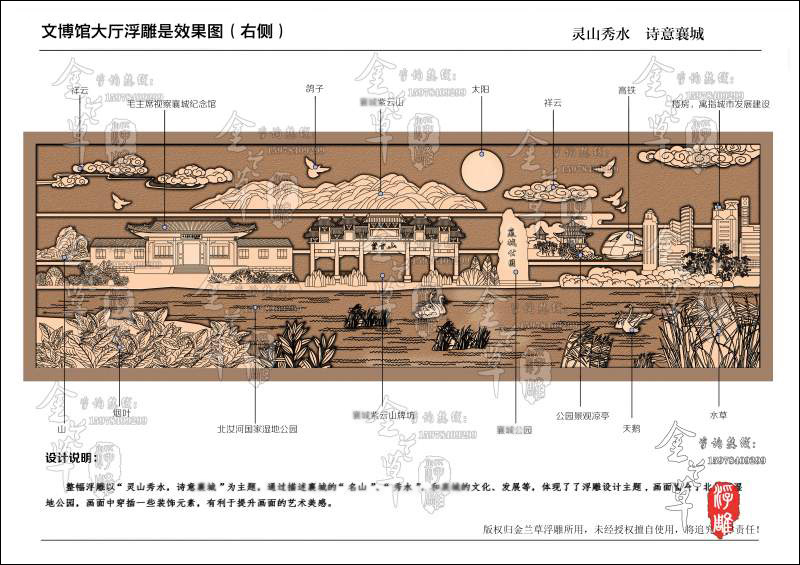 某縣縣規(guī)劃館是某縣縣展示歷史文化、城市規(guī)劃的展館金蘭草浮雕受邀為其創(chuàng)作大廳浮雕文化墻,浮雕在整個(gè)場(chǎng)館的作用相當(dāng)于一個(gè)序的作用,必須符合整個(gè)場(chǎng)館的規(guī)劃,所以,在設(shè)計(jì)中,我們以“千年古縣,人文之都”、“靈山秀水,詩意某縣”為主題。