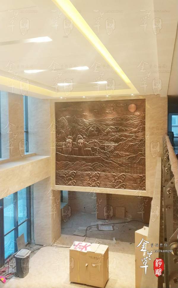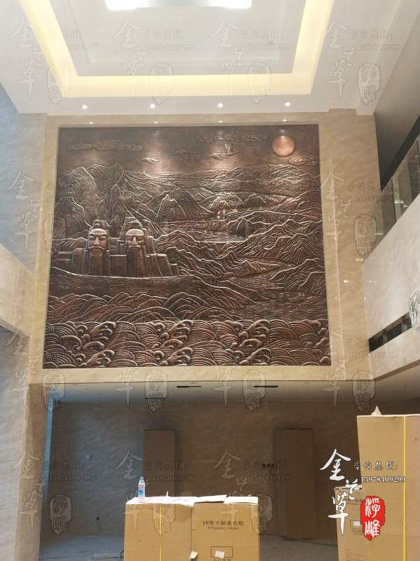 此企業集團文化浮雕是為大唐電力集團華中研究院所做的大廳景觀文化墻,浮雕原創設計,表現了河南的文化及山水名勝。浮雕的左側黃金分割點上是華夏始祖“炎黃二帝”雕像,是河南的象征,也是中華的象征;炎黃二帝雕塑身后是邙山、嵩山、太行山脈,滾滾黃河之水潤物大地,九曲十八彎,從山中而來,流入中原平原;浮雕畫面的背景,白云飄飄,太陽冉冉升起,天鵝從水間飛到天空、、、、、。浮雕是對河南文化的描繪,也是一幅美麗的山水花卷。