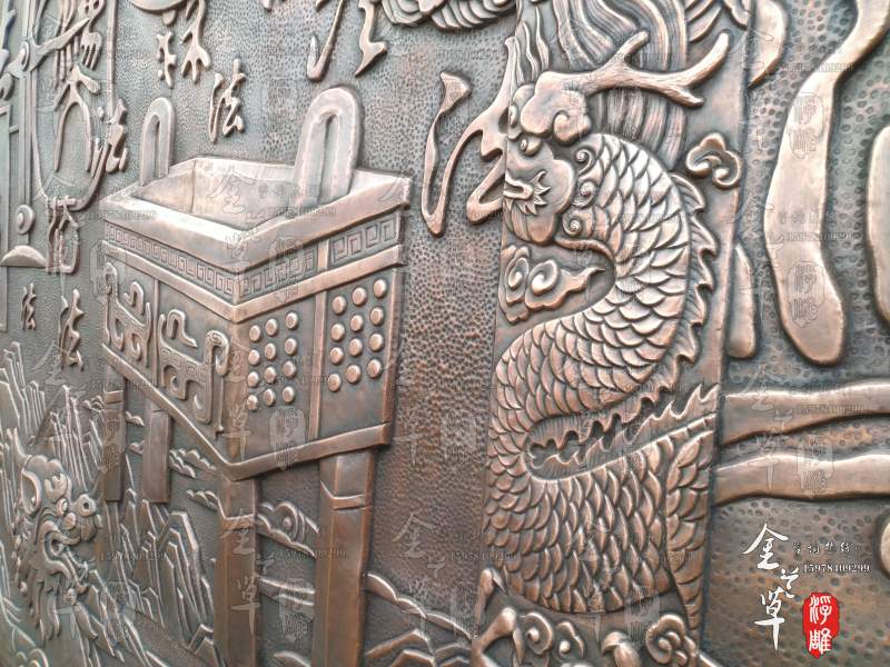 整幅浮雕面積不大,所以在設計上沒有過于復雜的表現(xiàn),簡介大方,一目了然,浮雕在制作工藝上采用紫銅鍛造,細致逼真,工藝精湛,得到客戶認可。