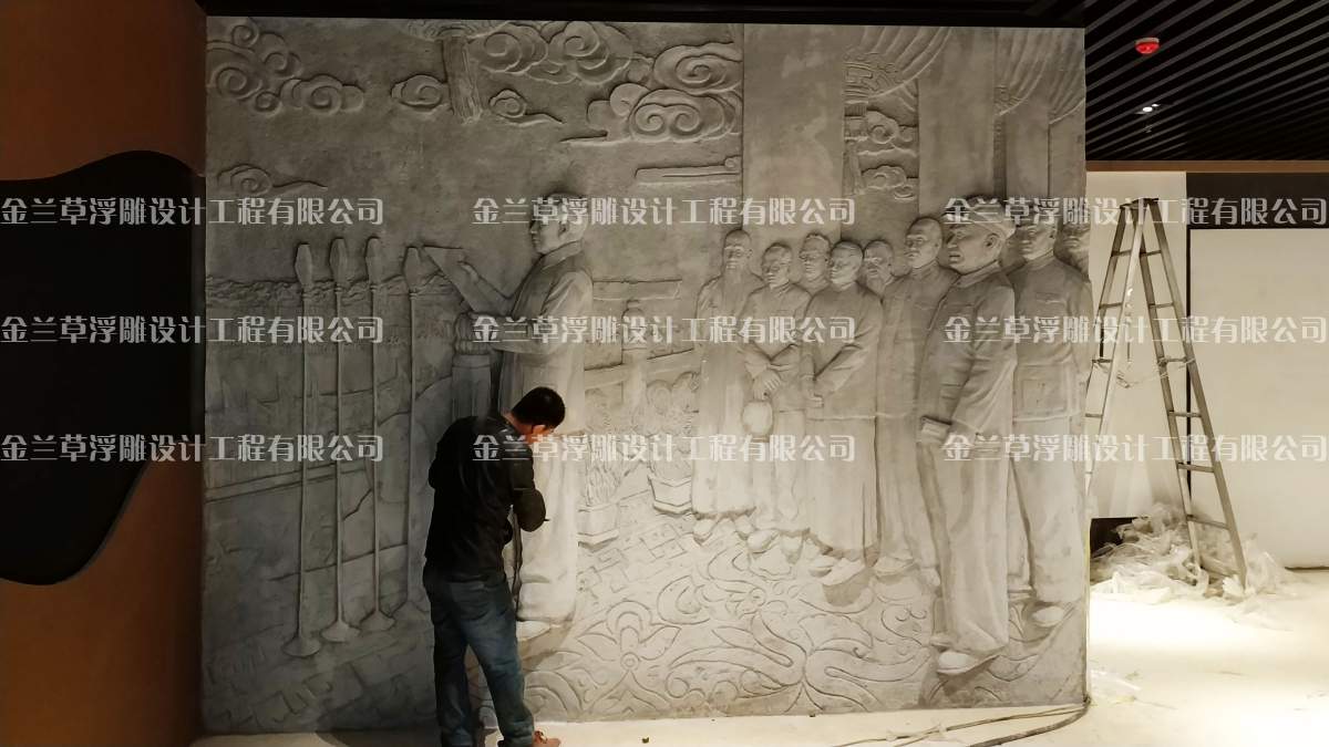 浮雕翻制完成,后期就是開始安裝了,經過工人們的努力,安裝效果還是很不錯的,因為此面浮雕墻還有做投影布的作用,有時候會放投影投在上面,所以,客戶要求將浮雕做成灰色效果,灰色效果當然沒有別的效果好,當然,效果也還是不錯。