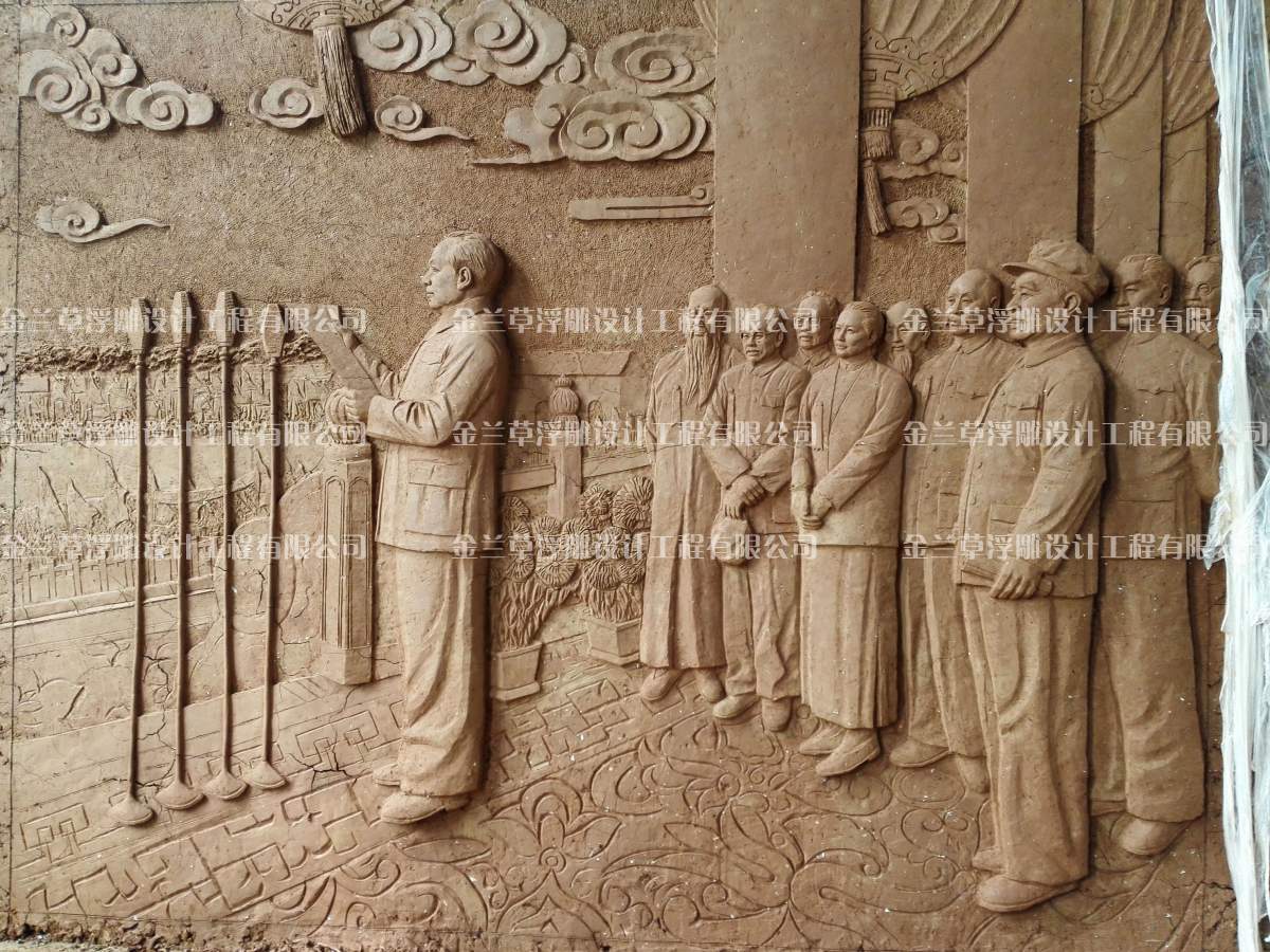 做黨建題材浮雕文化墻,最重要的就是毛主席站著講話的形象,這是畫面的重中之重,這個任務表現不好,整幅畫面就失敗了一半,我們金蘭草浮雕泥塑老師有二十幾年雕塑工作經驗,對人物的把控能力很強,在泥塑老師的認真、努力、細致的刻畫下,浮雕人物形象還是比較生動的,也得到了客戶的認可。