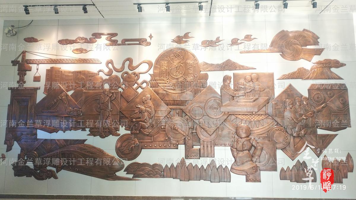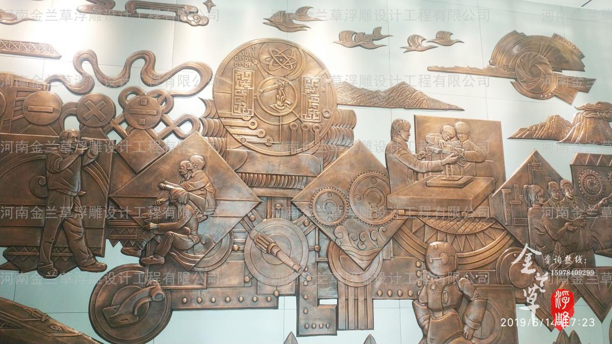 大廳浮雕是金蘭草浮雕公司設計和制造的,浮雕總面積四五十平米,位于教學樓大廳位置,是學校師生必經之地,所以位置相當重要。前期設計中,考慮到屬于機電類工科學校,所做浮雕文化墻要技能體現文化感,也最好有些工業質感。在金蘭草浮雕設計師與院方領導的多次討論下,設計方案也多次調整修改,最終,確定了浮雕鏤空展現,背景選用金屬鋁塑板,兩方面兼顧。