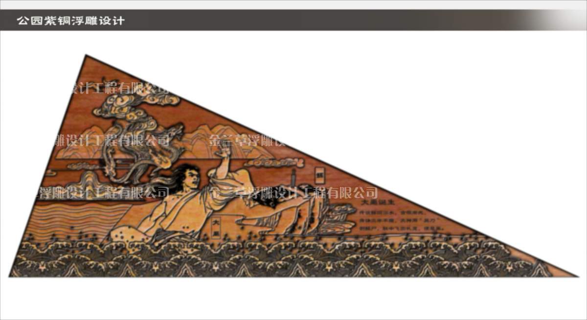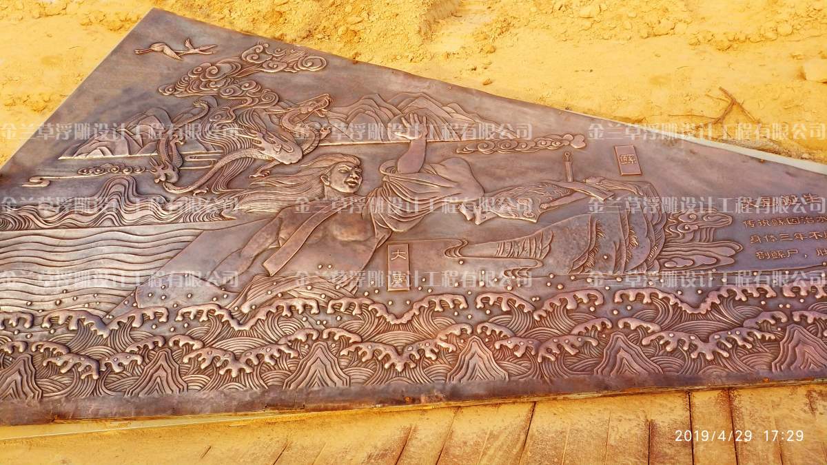 公園景觀的提升讓浮雕雕塑等被大面積使用,公園浮雕壁畫的設(shè)計也顯得很重要了,沒有好的設(shè)計就不會有好的作品,只要是稍微懂點的人大概也知道這個道理。金蘭草浮雕作為專業(yè)浮雕公司,不光工藝做的精湛,而且懂得設(shè)計,能夠為客戶量身定制設(shè)計方案。公園浮雕壁畫很多都是在表現(xiàn)“故事”或者“文化”,讓人在欣賞之時感受文化藝術(shù)氣息。此公園紫銅浮雕便是講述一個故事——大禹帝的誕生。