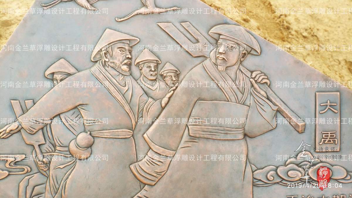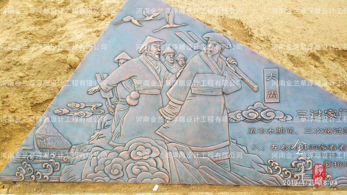 這幅廣場浮雕壁畫設計的主題是選自我們耳熟能詳的故事“三過家門”,根據各種版本的傳說,我們選取了大家熟知度更高的版本:“禹治水期間,三次路過家門而不入,左右勸其回家看看,禹因治水要搶時間而推辭。”浮雕也就以此為主題就行設計。