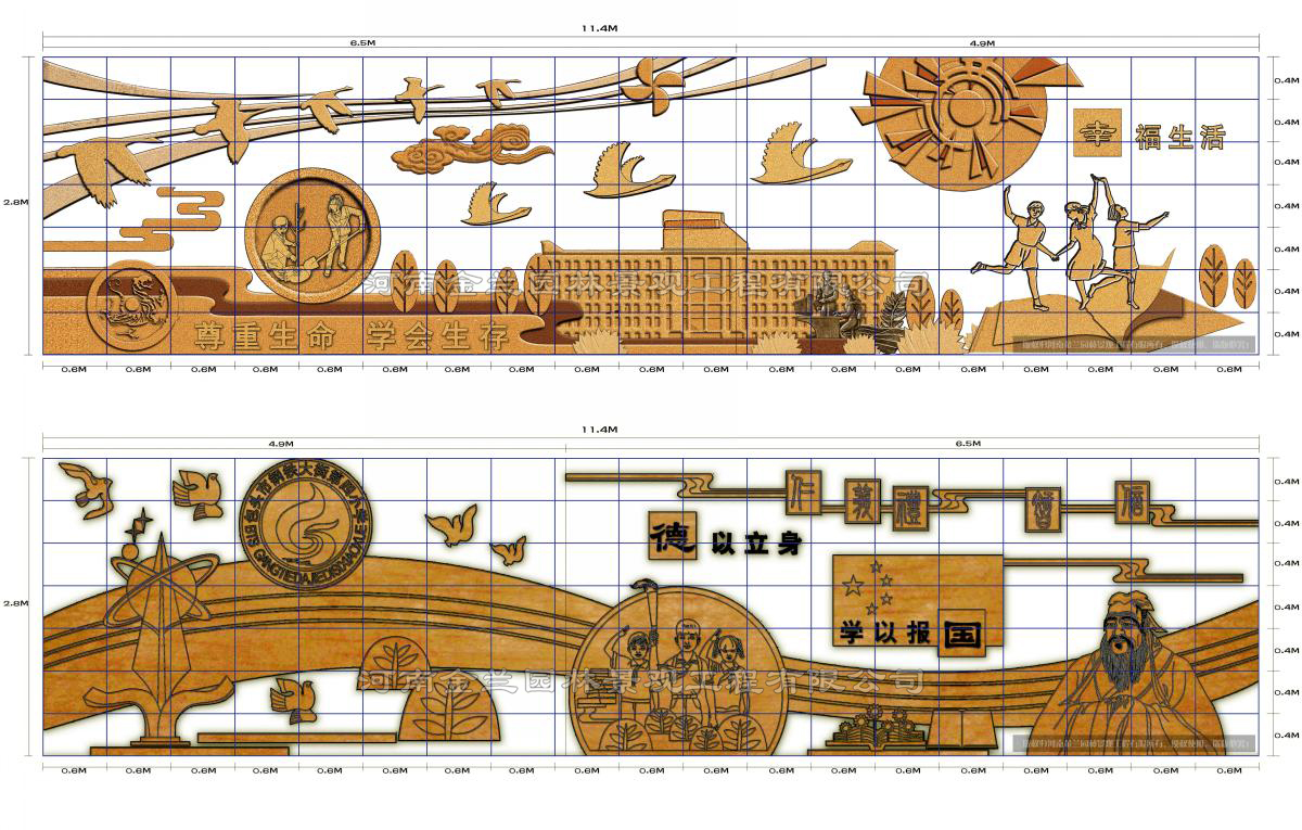 在內蒙古包頭市鋼鐵大街第四小學的校門口,兩座總長22.8米、高3.0米的鏤空浮雕文化墻落成。作為校園文化的重要標識,這組由金蘭草浮雕設計承建的浮雕作品,以泥塑手工翻制玻璃鋼材質結合仿銅工藝,將“尊重生命,學會生存”的教育理念與中國傳統文化精髓巧妙融合,成為承載學校精神內核的立體畫卷。