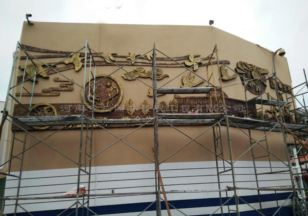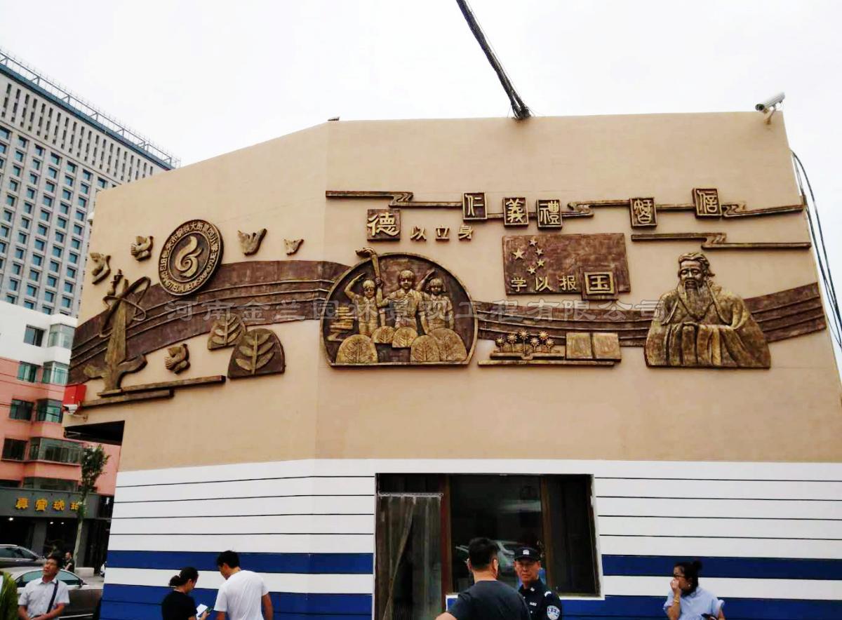 區別于傳統浮雕的平面化呈現,金蘭團隊采用鏤空設計手法,通過虛實對比增強視覺層次。3.0米的高度上,浮雕主體與鏤空背景形成通透感,陽光穿透時,光影在墻面上游走變幻,使靜態的畫面產生動態的韻律。材質選擇上,泥塑手工翻制確保了細節的生動性,玻璃鋼的輕盈與仿銅效果的厚重感完美結合,既保證了戶外環境中的耐久性,又賦予作品古樸典雅的氣質。這種工藝創新不僅提升了視覺效果,更讓文化墻成為兼具藝術性與功能性的校園地標。